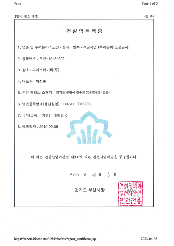 건설업등록증(도장공사) 페이지 정보 작성자 관리자 댓글 0건 조회 118회 작성일 23-05-25 09:18 목록 본문 건설업등록증(도장공사) 이전글건설업등록증(구조물해체, 비계공사) 23.05.25 다음글사업자등록증 23.05.25