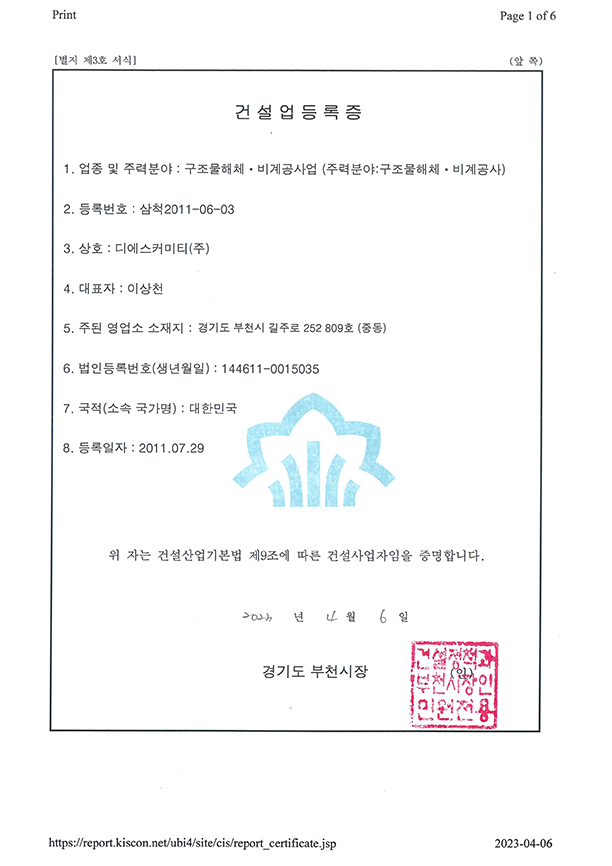 건설업등록증(구조물해체, 비계공사) 페이지 정보 작성자 관리자 댓글 0건 조회 119회 작성일 23-05-25 09:18 목록 본문 건설업등록증(구조물해체, 비계공사) 이전글ISO45001 23.05.25 다음글건설업등록증(도장공사) 23.05.25